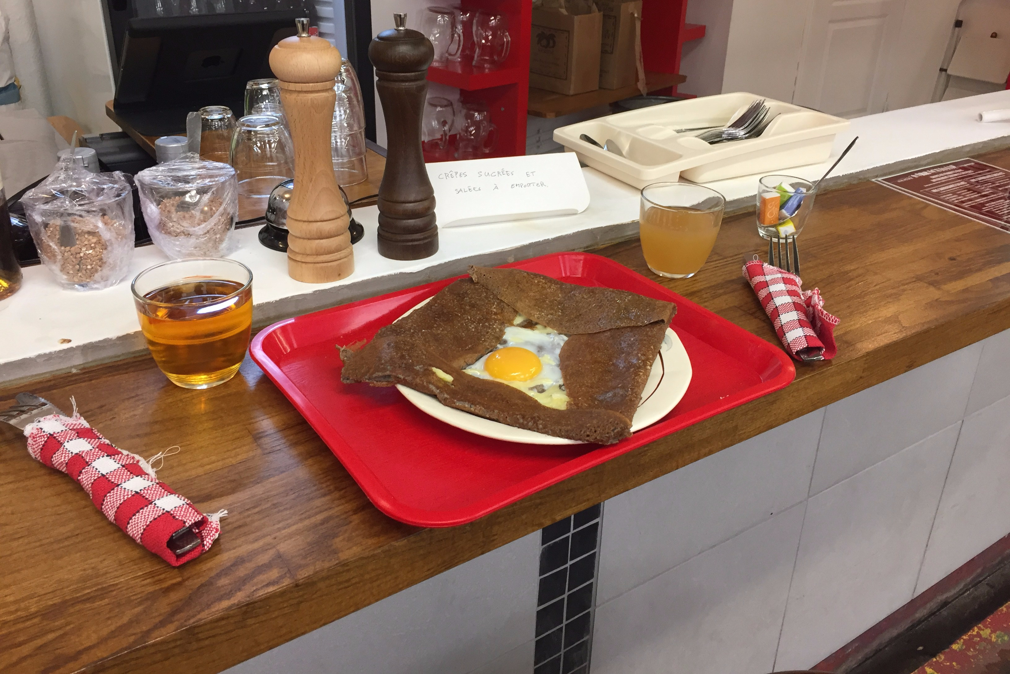 Today we had an egg and cheese crêpe (I think it would be called a farmer’s crêpe if had had ham but of course we asked for no ham).