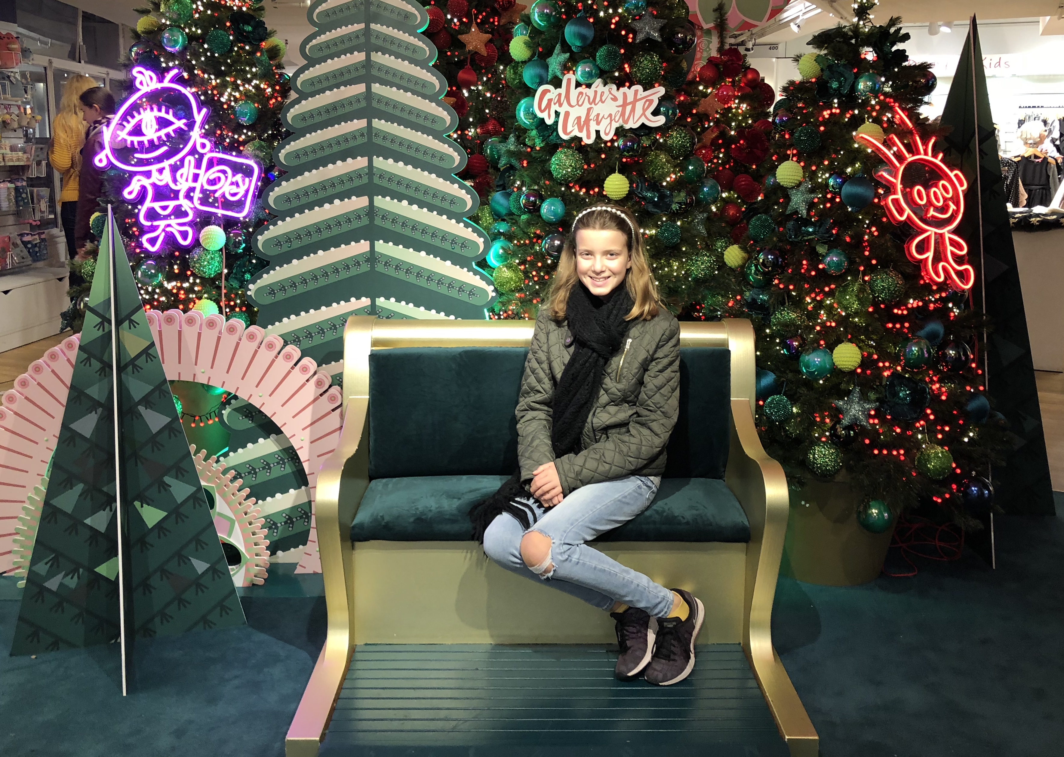 Galeries Lafayette is ready for Christmas! They are waiting for Santa! He only arrives Nov. 25 but his spot is ready! Fille was testing it out last week. Also, the window displays are up and the Christmas tree is in place in the Dome of Galeries Lafayette – but (shh!) its not as nice as last year’s tree!