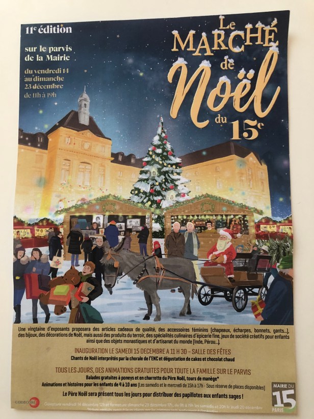 If you are in the 15th there is a cute little Christmas market in front of city hall until the 23rd of December, 2018. There are about 15-20 stalls. A few food places (crepes, tacos!), a few gift places. What is nice is that they try to have vendors which are local businesses. So by shopping at the market you get to know your local vendors.