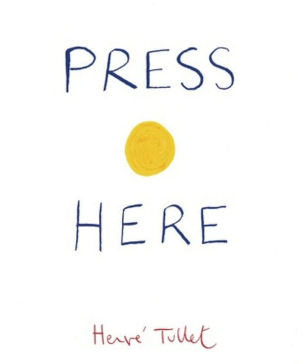 Each page asks the reader to do one simple thing, like “press here.” On the next page something has happened as a result. For example, the one yellow dot is now TWO yellow dots. Or if you shake the book, the dots fall to the bottom of the page.
