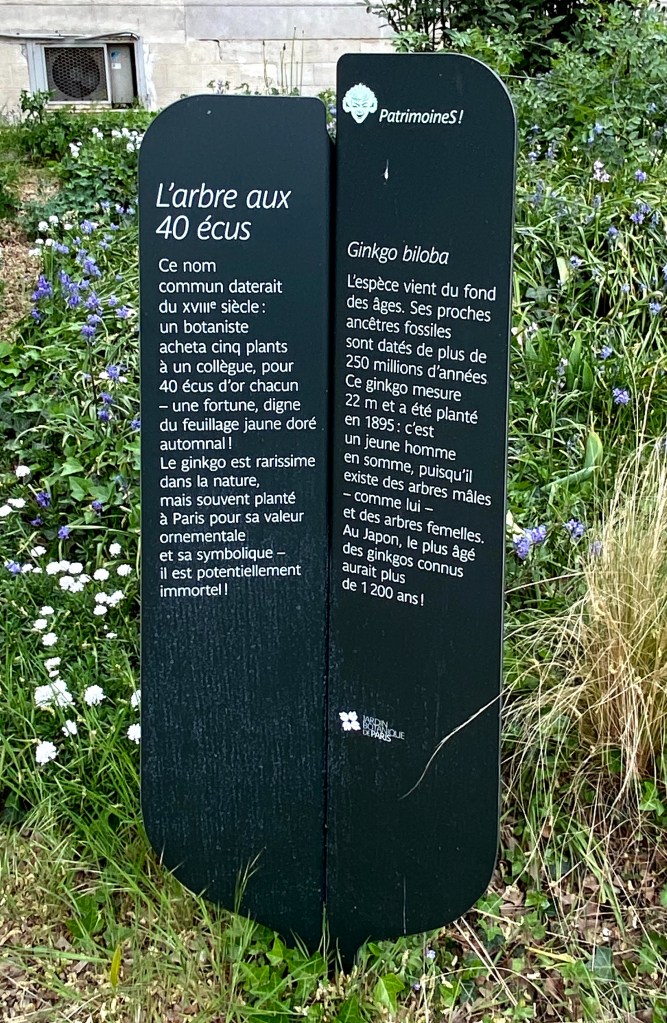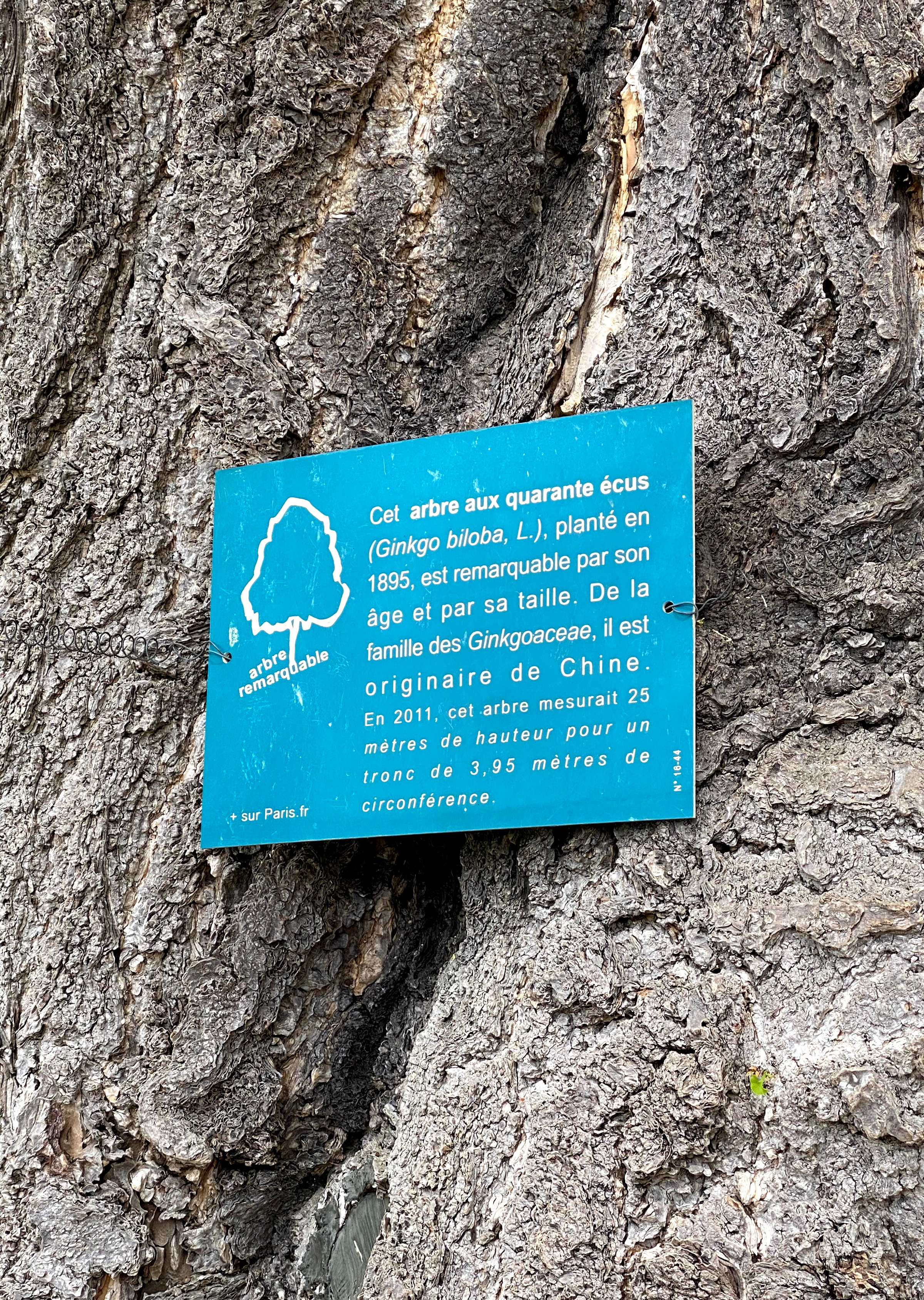 Here is an example of a gingko tree which as the plaque notes, is remarkable for both its age and its size. It was planted in 1895. Also, there is an interesting story as to why it in french it is called “L’arbre aux 40 écus”. The name comes from that was the price of the tree that was paid back then! I guess it was a lot.