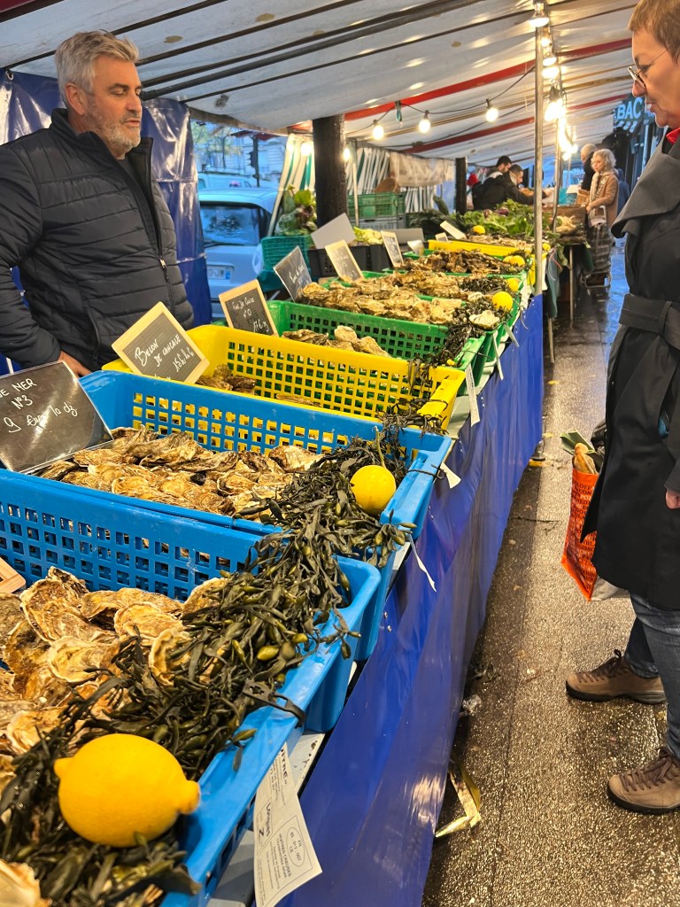 The return of our local weekend oyster guy. Just in front of our local Carrefour we have a local oyster guys. He first appears in late November and stays until the weather gets too warm for selling oysters outside without refrigerations – so until March or so. He comes from Bretagne and arrives Friday nights and sells oysters through Sunday morning. Since the Carrefour is just two steps from our door it is super convenient.