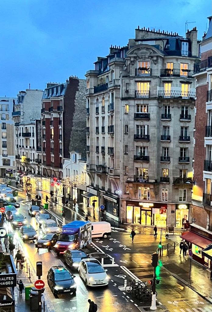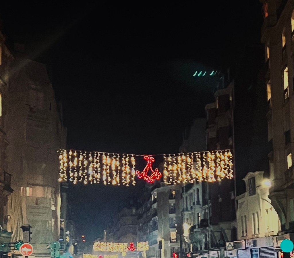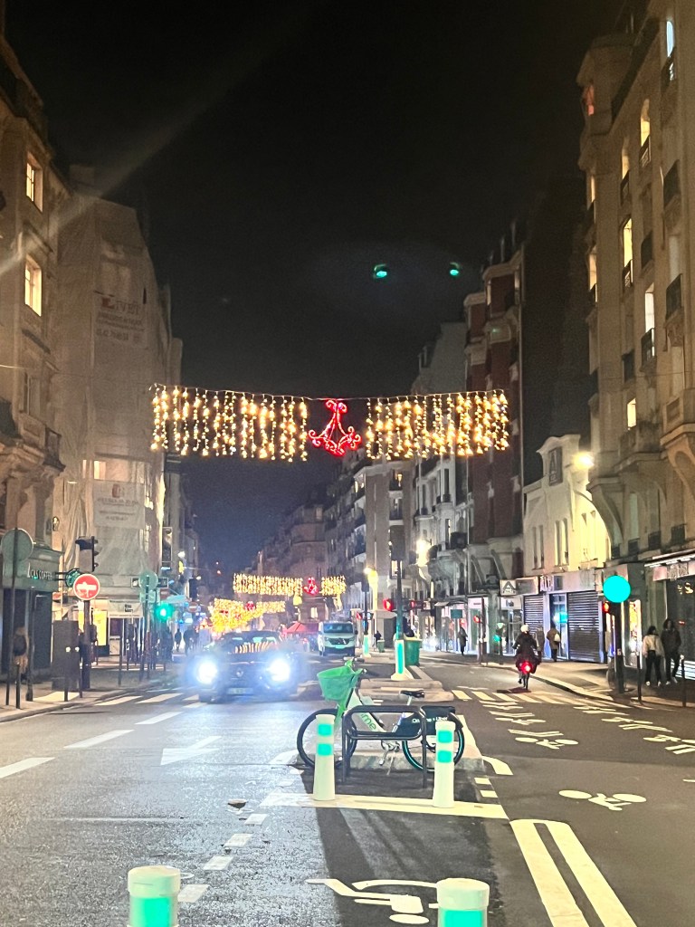 Christmas lights on our street. The Christmas lights appear on our street. They are usually turned on around Dec 1, though there isn’t a strict date. Of course, it isn’t just our street. Most streets with many shops also have lights. The “commercants” – the shopkeepers – band together pay for them. Each section of commercants therefore has a different set of lights. Depending on the street the lights run 3-5 blocks long. The ones immediately below us start where we are and go south. I guess the commercants going north didn’t want to participate!